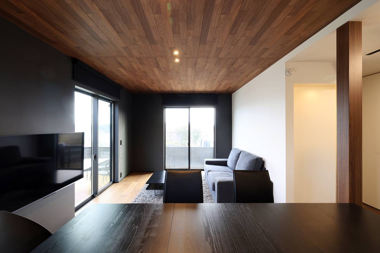Living&Dining 広大な淡路島の空へひと続きのリビング。 24帖の広々としたLDKはいずれも2階にあり、大胆な開口部の設計により広大な淡路島の空へひと続き。8人掛けのダイニングテーブルではゆったりと語らいながら食事が楽しめます。また、昼間はワーケーションの作業デスクとしての利用や、宿泊者同士の活発なブレストの会場としても便利。 天井はゆるやかに勾配をつけることで空間全体がより広々と感じられる設計になっています。また室内の灯りには間接照明を用いることで、深いくつろぎ空間を演出しています。 Bed room Back